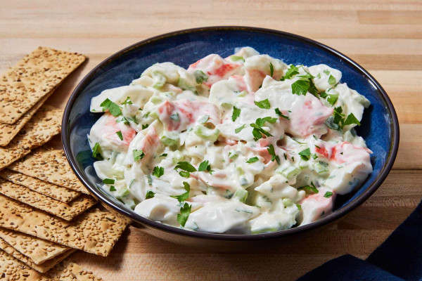 A refreshing and flavorful salad. It features tender crab meat mixed with mayonnaise, herbs, and seasonings, often served with pasta or on lettuce.